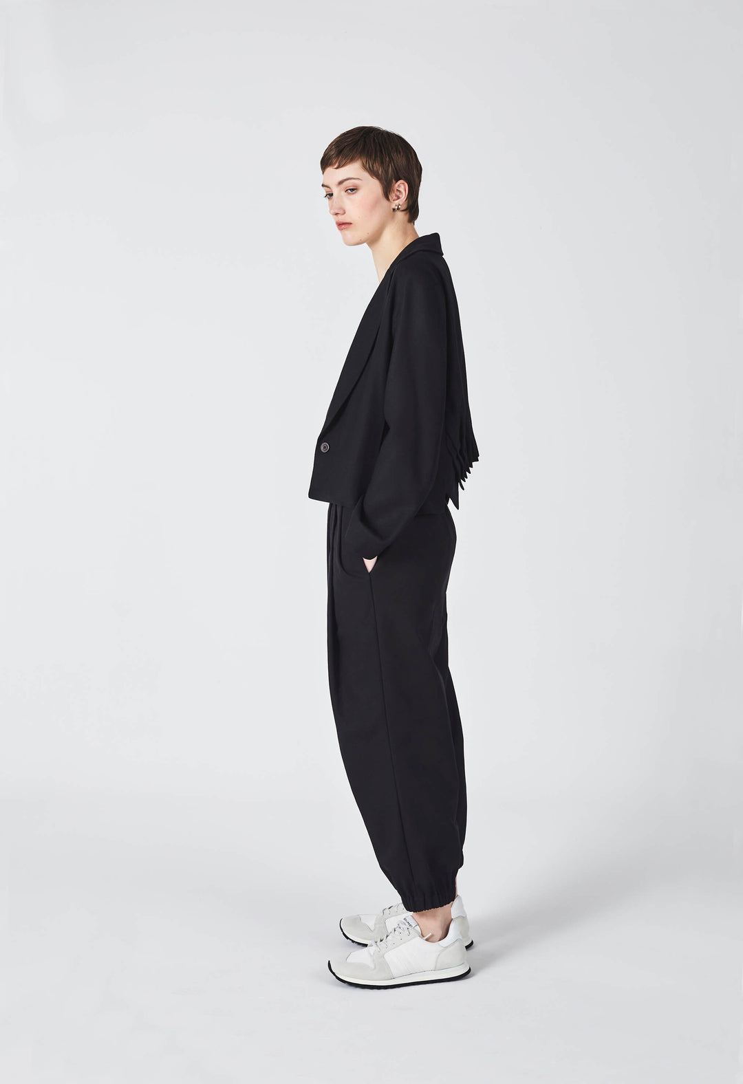 A cropped and relaxed jacket, featuring an intricate pleat design and hidden pockets. Made from a beautiful wool and rayon Italian cloth. With a gentle drape and soft handle.