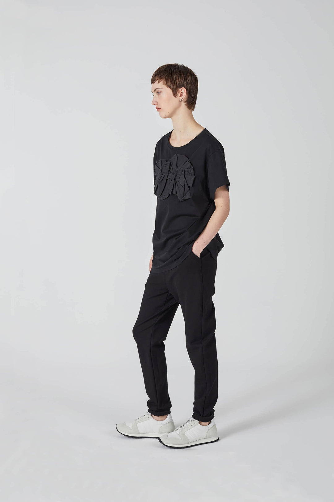 woman wearing black, short sleeved, handmade, origami top, original artistic design